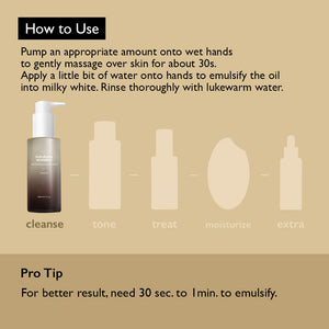 - Apply: Dispense an appropriate amount of cleansing oil onto dry hands and gently massage it onto your dry face. Focus on areas with makeup or impurities.