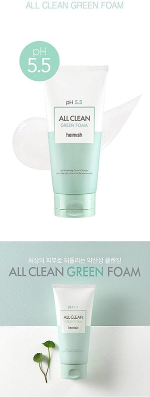 Experience a refreshing cleanse with the HEIMISH pH 5.5 All Clean Green Foam! This gentle yet effective foaming cleanser is designed to maintain your skin's natural pH balance while effortlessly removing impurities, makeup, and excess oil. Infused with a blend of natural ingredients, including green tea and plant extracts, it nourishes and soothes the skin, leaving it feeling clean, hydrated, and refreshed.
