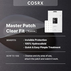 Experience clear, healthy skin with the COSRX Master Pimple Patch Clear Fit. This pack includes 18 ultra-thin, discreet patches designed to tackle blemishes effectively while blending seamlessly with your skin.
